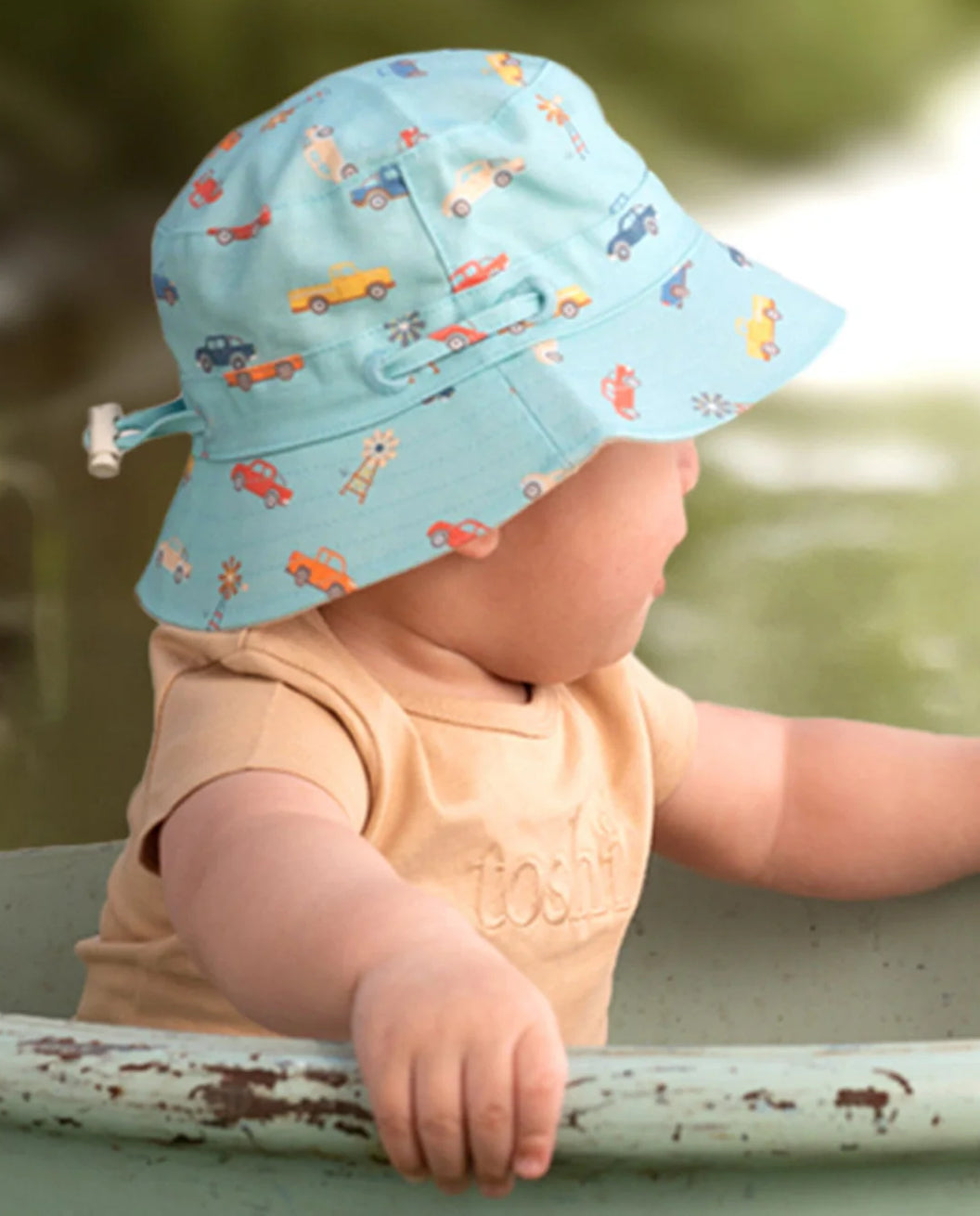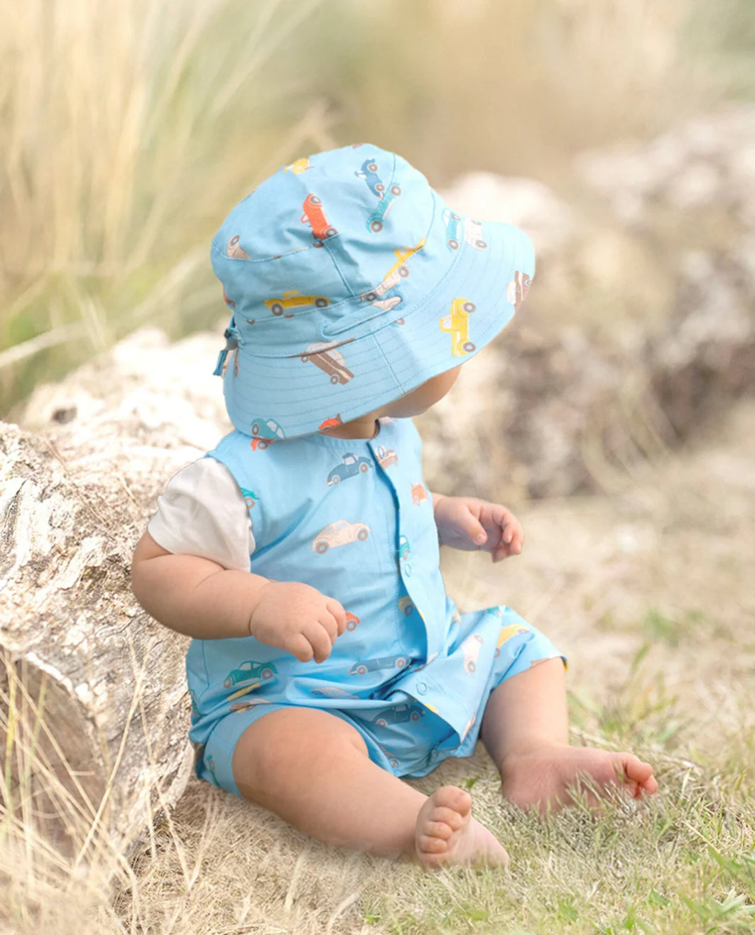 Toshi presents Sunhat Ryder, a classic, gender-neutral sunhat for children of all ages. The sunhat has a broad and well-structured brim. The UPF 50+ UV rating indicates maximum sun protection. The head tie with toggle creates adjustable sizing. A chin tie with toggle secures the hat for ease of wear. The security release clasp on the chin tie is designed to enhance wearer safety. The sunhat is fully lined for additional comfort. An original and exclusive Toshi print design is featured.